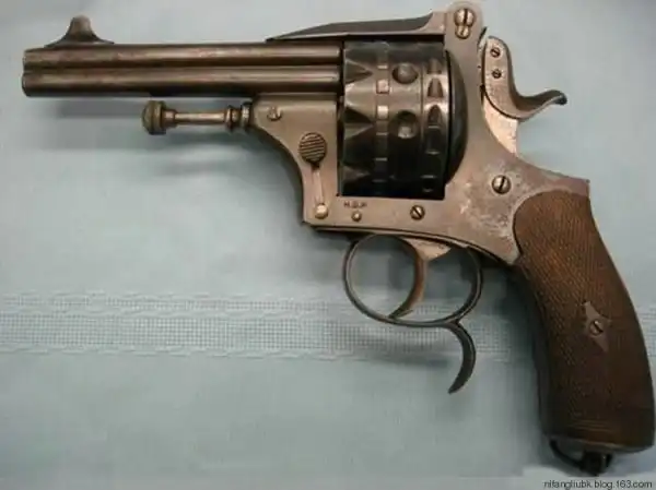 При повторениях циклов работы ударно-спускового механизма барабан поворачивается то на одну четырнадцатую часть оборота, то — дважды подряд — на одну двадцать восьмую. Таким образом, через каждые два выстрела из верхнего ствола следует один выстрел из нижнего ствола. Под стволом может быть смонтирован откидной штык. Шамело — Дельвинъ. Калибр 12 мм. Особенности револьвера — левое вращение барабана, расположение экстрактора и дверцы слева, смещенный вправо курок (Франция). Шпилечный револьвер со стволом, откидывающимся вверх. Застежка ствола расположена перед спусковой скобой.