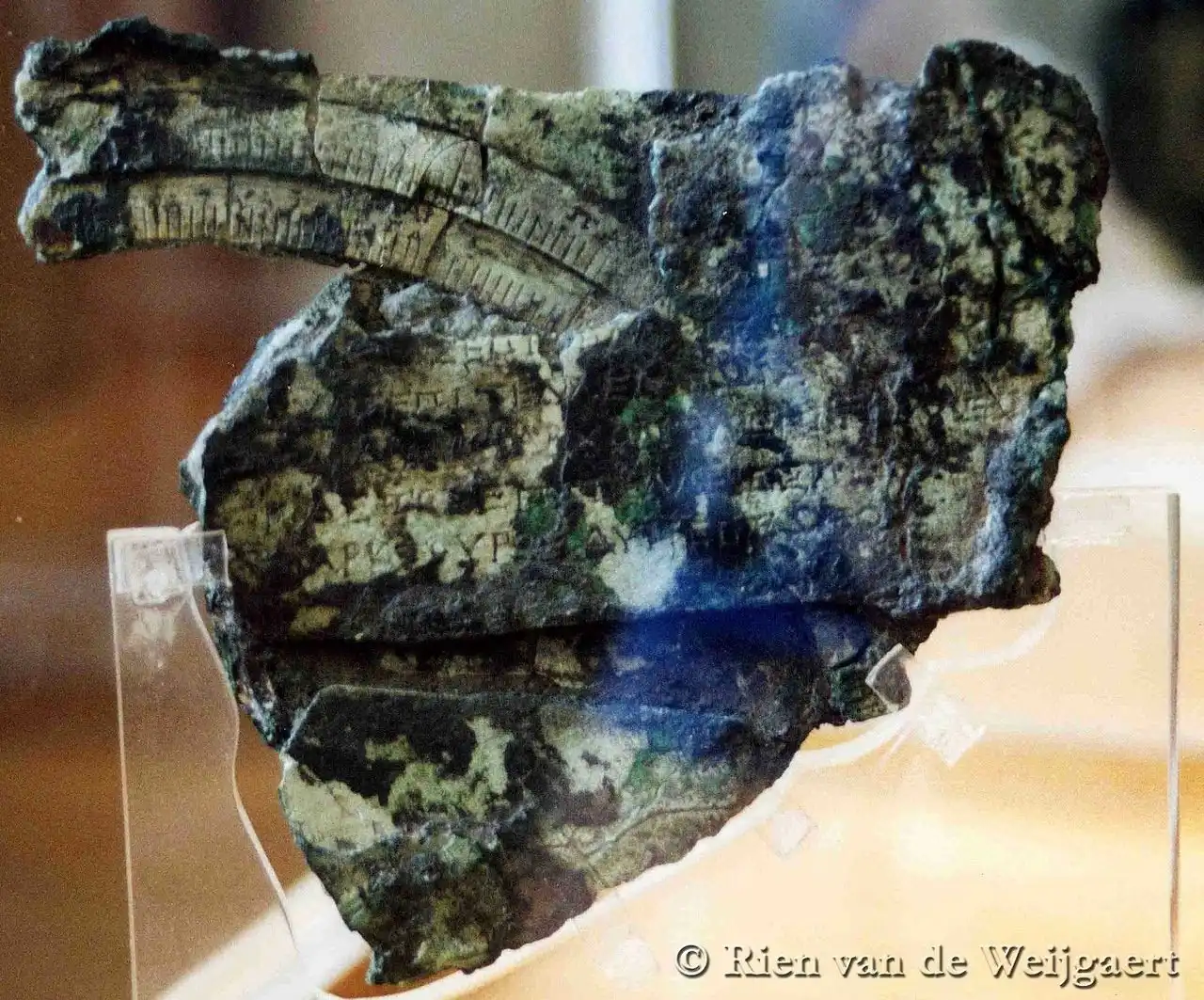 Наконец, на тонкой бронзовой пластине, прикрывающей передний циферблат, находилась т.н. «парапегма» — астрономический календарь с указанием восходов и заходов отдельных звезд и созвездий, обозначенных греческими буквами, корреспондирующими с теми же литерами на зодиакальной шкале.