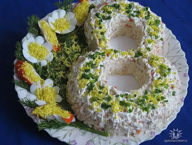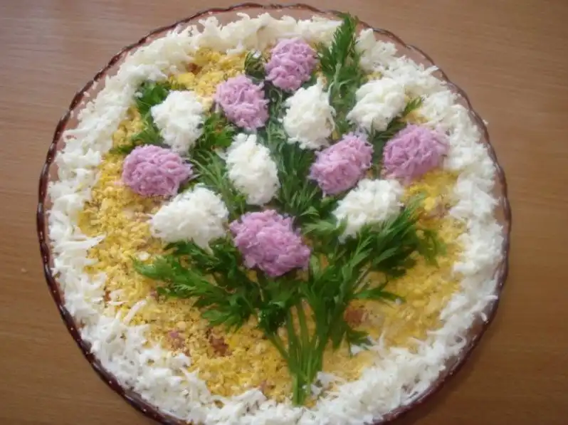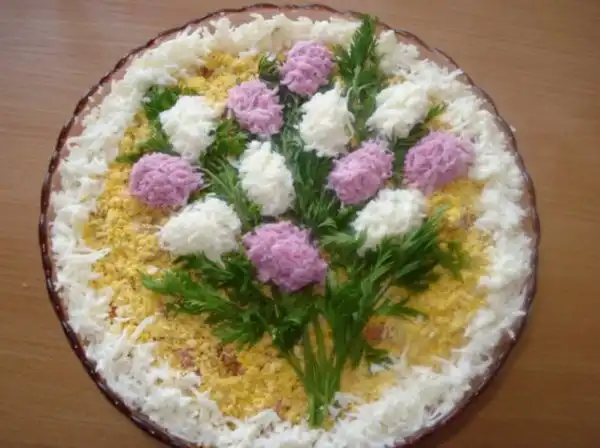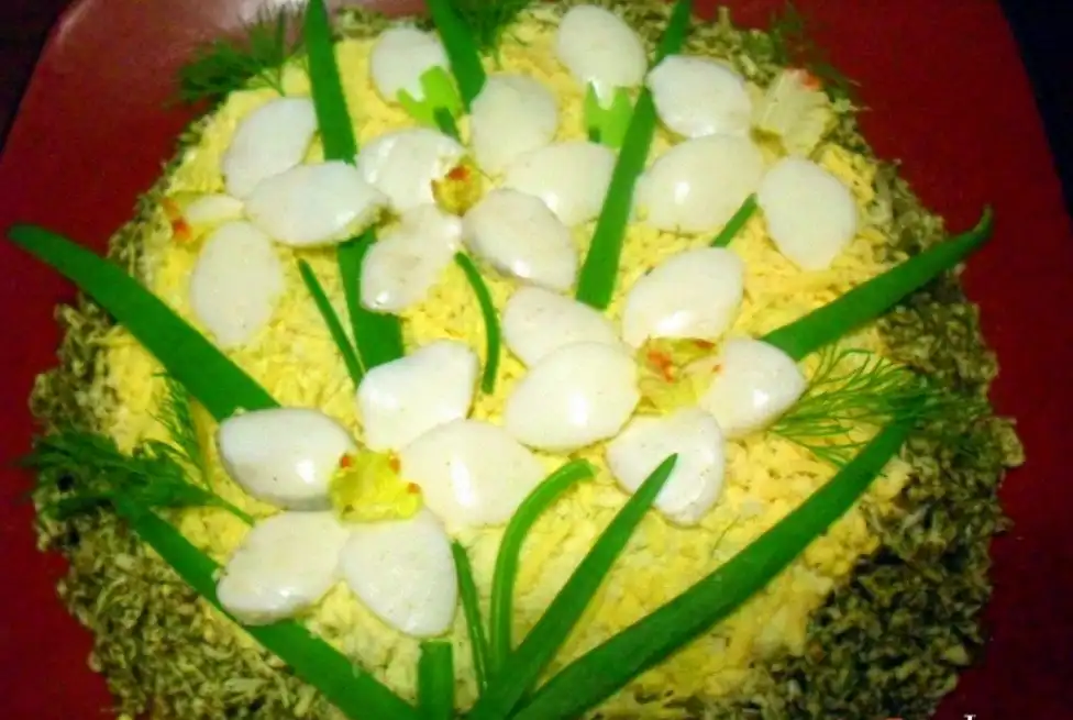 А теперь приступим к сборке салата. Первым слоем пойдет неокрашенный белый рис, промазанный салатной заправкой.