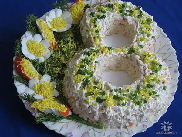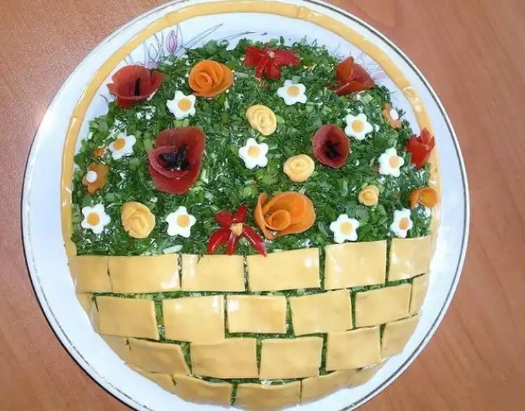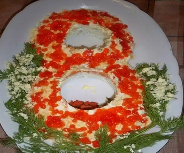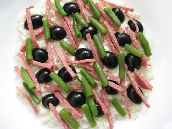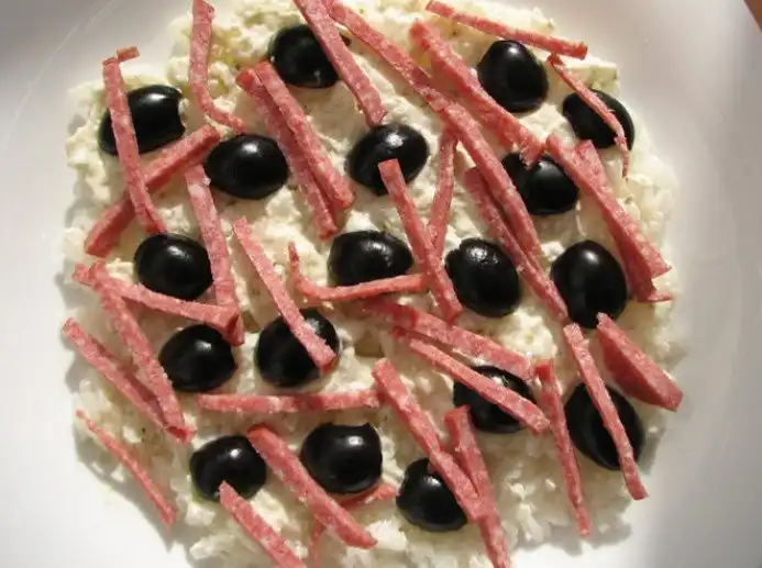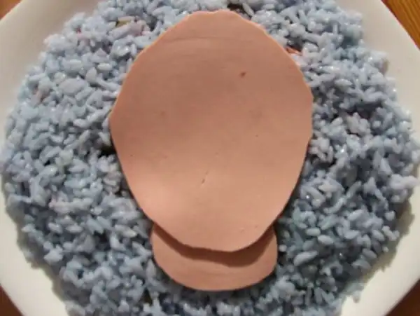 И в серединку выкладываем вырезанные овал лица и шею из вареной колбаски.
