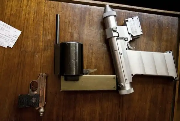 Первым побывавшем в космосе оружием стал пистолет Макарова, входивший в аварийный запас космонавта еще с полета Юрия Гагарина. С 1982 года его заменило специально разработанное для выживания и самообороны в условиях нештатной аварийной посадки СОНАЗ – «стрелковое оружие носимого аварийного запаса», известное так же под маркировкой ТП-82, трехствольный пистолет космонавта.