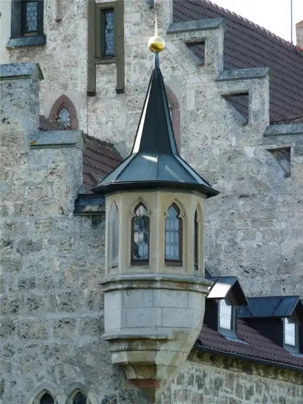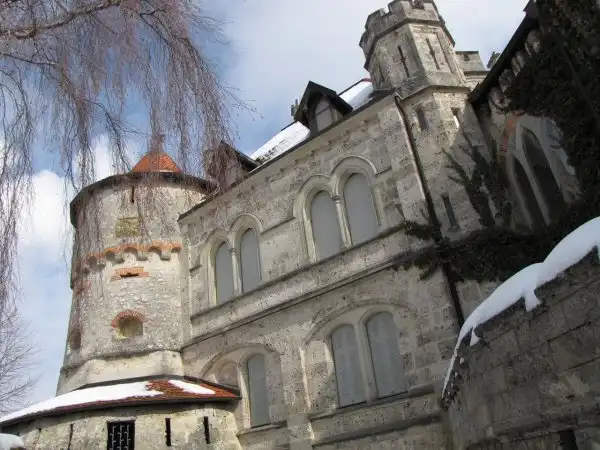 Результатом его усилий явился замок в неоготическом стиле, причем стены до второго этажа сохранились от старой крепости. За небольшим мостиком, служащим входом, вырастает замок, состоящий из множества компонентов: за воротами, украшенными башенками и зубцами, встает сначала двухэтажный, потом трехэтажный дворец со стрельчатыми окнами, уступчатыми щипцами и эркерами. За ними возвышается стройный донжон, увенчанный зубчатой короной.