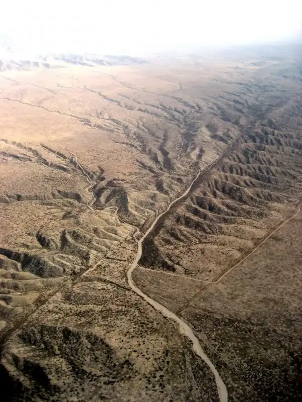 Разлом Сан-Андреас Жирная линия, идущая вниз от центра рисунка, — это вид в перспктиве знаменитого калифорнийского разлома Сан-Андреас. Изображение, созданное с помощью данных, собранных SRTM (радарная топографическая экспозиция) , будет использовано геологами при изучении динамики разломов и форм поверхности Земли, возникающих в результате активных тектонических процессов. Этот сегмент разлома находится к западу от города Палмдейл (штат Калифорния) , примерно в 100 км к северо-западу от Лос-Анджелеса. Разлом представляет собой активную тектоническую границу между Североамериканской платформой — справа и Тихоокеанской — слева. По отношению к друг другу Тихоокеанская платформа от зрителя, а Североамериканская — по направлению к зрителю. Видны также два больших горных хребта: слева — горы Сан-Габриэль, вверху справа — Техачапи. Еще один разлом — Гарлок, лежит у подножия хребта Техачапи. Разломы Сан-Андреас и Гарлок встречаются в центре изображения близ города Горман. Вдали, выше гор Техачапи, лежит Центральная Калифорнийская долина. Вдоль подножия холмов в правой части изображения видна Долина Антилоп.
