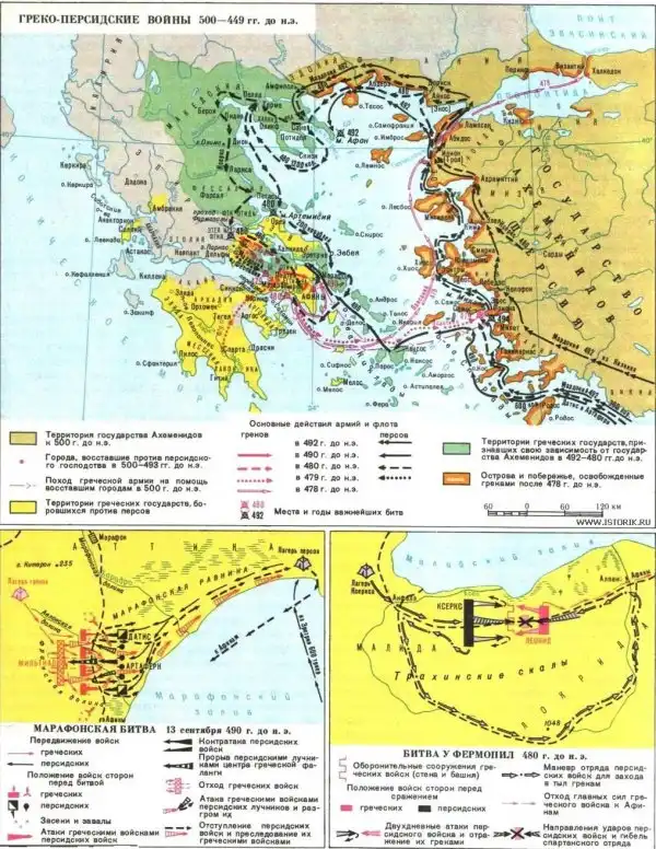 В Марафонской битве греки дали первый отпор персам. Этот бой показал, что тяжеловооруженной, хорошо обученной пехоте не страшна иррегулярная конница. На месте сражения на Марафонском поле, рядом с братской могилой воинов, павших за родину, был воздвигнут памятник в честь вождя греков Мильтиада. Сцены из марафонской битвы были изображены в одном из портиков, находившихся на главной площади Афин.