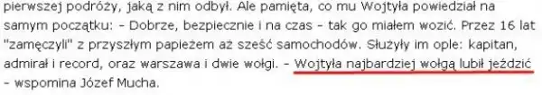 На этом фоне полное отсутствие информации о чёрной «Волге» будущего Папы Римского выглядит несколько странно. Есть большое интервью водителя Кароля Войтылы, который возил священника непрерывно в течении 16 лет!!! Вместе они проехали более полумиллиона километров. Так вот по свидетельству этого водителя как-раз чёрная советская «Волга» была любимой машиной Кардинала!