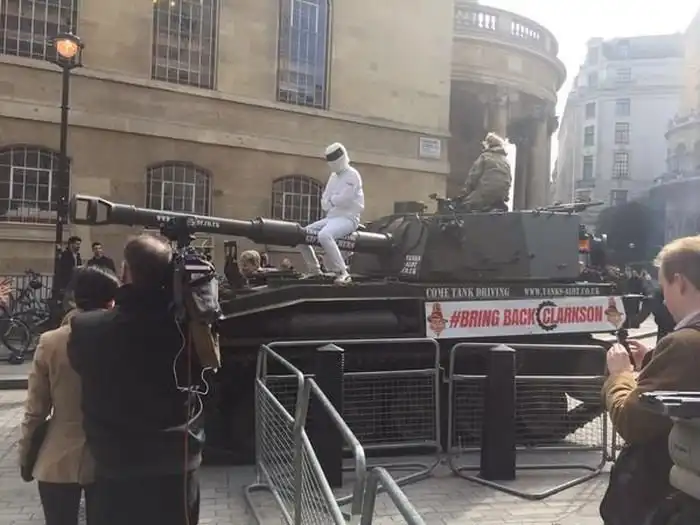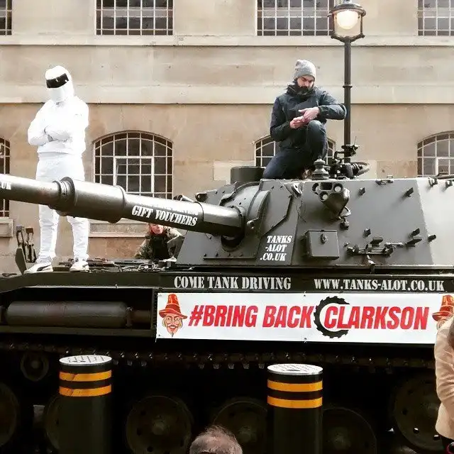 В поддержку отстраненного от эфира скандального ведущего популярной передачи Top Gear Джереми Кларксона в сети собрали миллион подписей и подвезли их к штаб-квартире BBC на танке. На танке был плакат с надписью «Верните Кларксона», а на башне сидел человек в костюме гонщика Стига, который и передал коробку с подписями представителям BBC. Напомним, что Джереми Кларксон был отстранен от эфира после того, как ударил продюсера Ойзина Таймона. Двое других ведущих, Джеймс Мэй и Ричард Хаммонд, отказались работать без прежнего соведущего.
