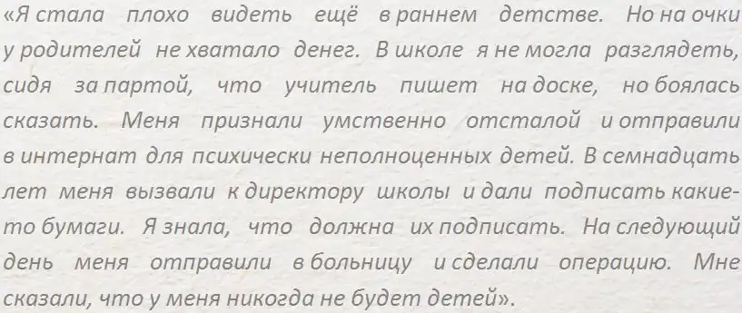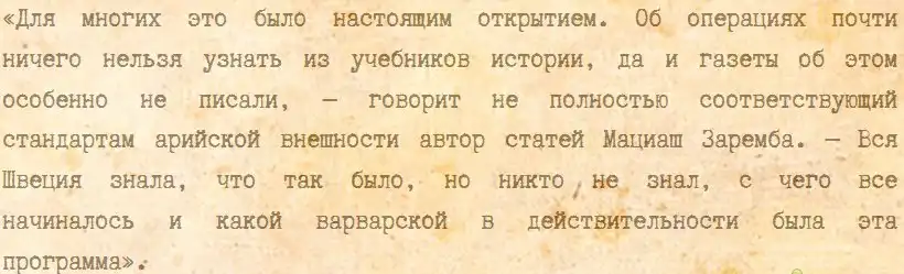«Я надеялась, что члены правительства лично попросят у меня прощения за совершенное насилие», — сказала корреспонденту французской газеты «Либерасьон» Барбро Лисен. В 40-х годах Барбро страдала эпилепсией — заболеванием, которое в то время было синонимом слабоумия. Когда она забеременела, врачи заставили ее сделать аборт и пройти стерилизацию. Только в 1970 году выяснилось, что поставленный женщине диагноз был неверным. «Для государства мы — прошлое. Заплатив нам деньги, правительство стремится навсегда забыть эту неприятную историю», — считает Барбро.