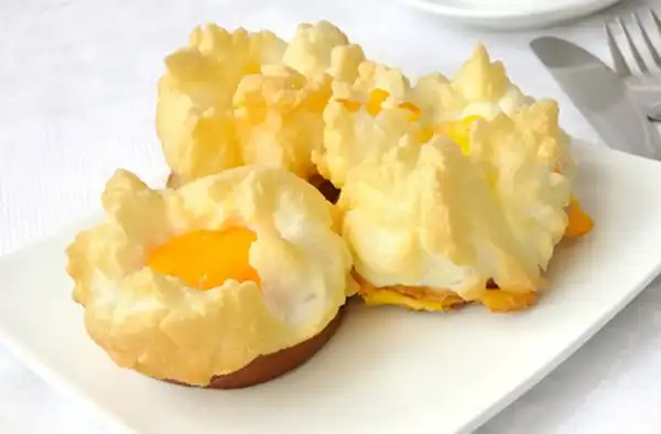 Необычный и трудоемкий рецепт яиц. Желтки отделяются от белков и остаются в половинке скорлупы. Белки взбиваются в пену и запекаются в духовке, после чего туда добавляется желток и сливочное масло. Орсини — популярная закуска в итальянской кухне, которая подается с сыром и овощами.
