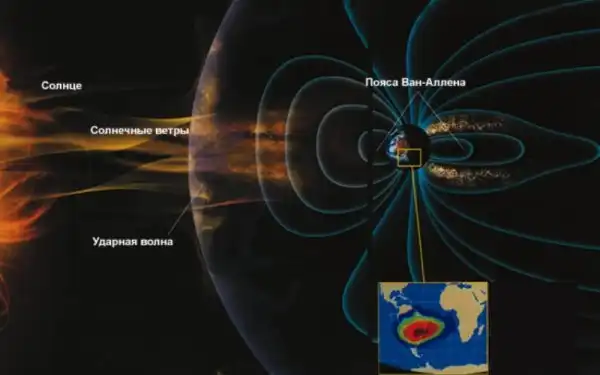 Окружая Землю как большой спасательный круг, пояс Ван Аллена представляет собой двухленточную радиационную область, которая формирует магнитное поле Земли. Пояс Ван Аллена “заманивает” радиоактивные частицы, которые исходят от солнечных вспышек, в ловушку и ограждает Землю от сильных солнечных ветров, которые также исходят от нашего Солнца. Та часть пояса, которая расположена ближе всего к Земле, заманивает протоны в ловушку, а та группа, которая расположена дальше всего от Земли заманивает электроны в ловушку. “Протонный” пояс составляет 1200-1300 километров (750 – 800 миль) в высоту за исключением одного участка, над Южно-Атлантической аномалией, над нижней частью побережья Бразилии, когда он опускается на высоту 200 километров (приблизительно 124 мили) от поверхности Земли.»
