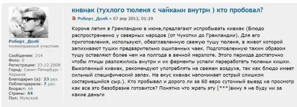 Кивиак не имеет никакого отношения к киви. Это деликатесное блюдо, распространено среди народов, проживающих в арктических широтах от Чукотки до Гренландии. Для приготовления кивиака берут обезглавленную тушу тюленя, которого набивают тушами небольших местных птичек из семейства чистиковых ( не потрошёнными). А затем «консервируют» все это дело, замазывая разрезы на шкуре тюленя — салом. После таких подготовительных работ, всю эту «вкусняшку» закапывают в землю и ждут примерно пол года, пока деликатес «приготовится».