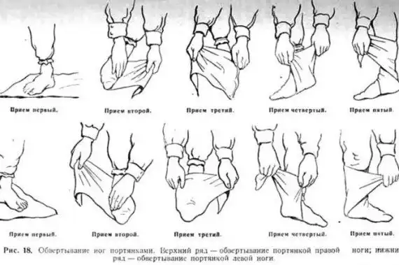 Кроме того, портянки удобны ещё и тем, что в случае их намокания, их достаточно намотать другой стороной, тогда нога по-прежнему останется сухой, а мокрая часть портянки будет тем временем высыхать.