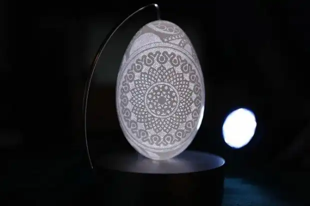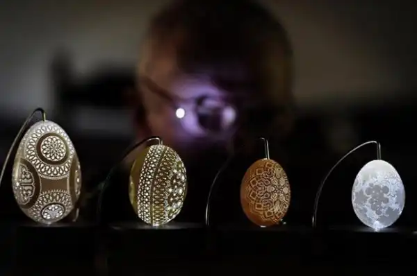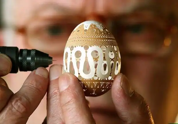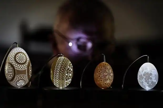 В общей сложности, Франк Гром (Franc Grom) делает в каждом яйце от двух с половиной до семнадцати тысяч крошечных отверстий. Как ни странно, но изначально свой опыт словенец приобретал, работая с слоновой костью. Его серия пасхальных яиц демонстрирует всю хрупкость каркаса яичной скорлупы. Дополнительная подсветка же, заставляет пасхальные яйца по-настоящему светиться. Большая часть работ словенского мастера не продается а экспонируется в различных музеях Европы.