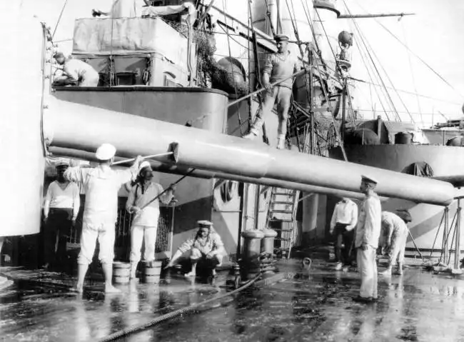 Император Николай II на гребном катере обходит эскадру Черноморского флота.