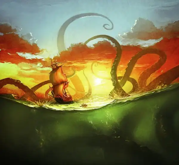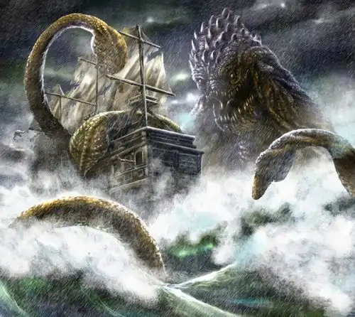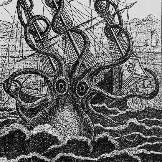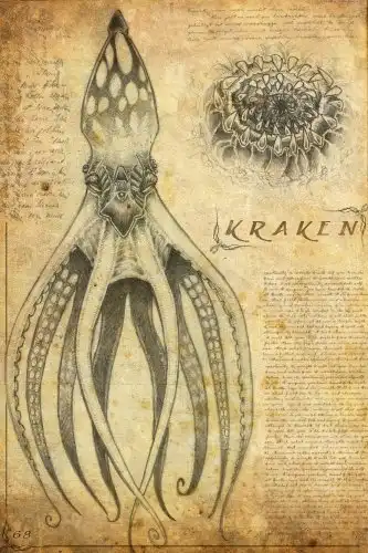 Вы слышали про КРАКЕНА? Его вид ужасен. Голова квадратная, вся в колючках, острые и длинные рога торчат из нее во все стороны, оттого похож зверь на вырванное с корнем дерево. Длина головы — двенадцать локтей, она черная, и огромные сидят на ней глаза... Ширина глаза — один локоть. Глаза красные и огненные, а потому темной ночью кажется, будто под водой пламя горит. С головы бородой висят вниз волосы, толстые и длинные, как гусиные перья. А туловище у кракена небольшое — пятнадцать локтей. Одно такое чудовище легко может потопить много больших кораблей со множеством сильных матросов.