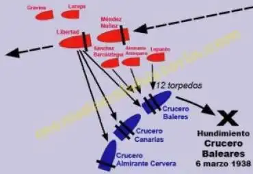 Из-за того, что в этом районе в январе-феврале участились атаки подводных лодок, в водах вокруг Балеарских островов постоянно патрулировали корабли Королевского флота. Из-за этого, когда немного спустя после полуночи 6 марта 1938 года второй дивизион эсминцев правительственной эскадры во мгле увидел надстройки "Балеареса", на всех эсминцах, его приняли за британский корабль. С эсминцев передали сигнал, согласно книге сигналов, которые имели силу и с началом гражданской войны.