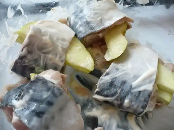 6. Выложить в каждый кусочек рыбы по 2-3 дольки яблока.