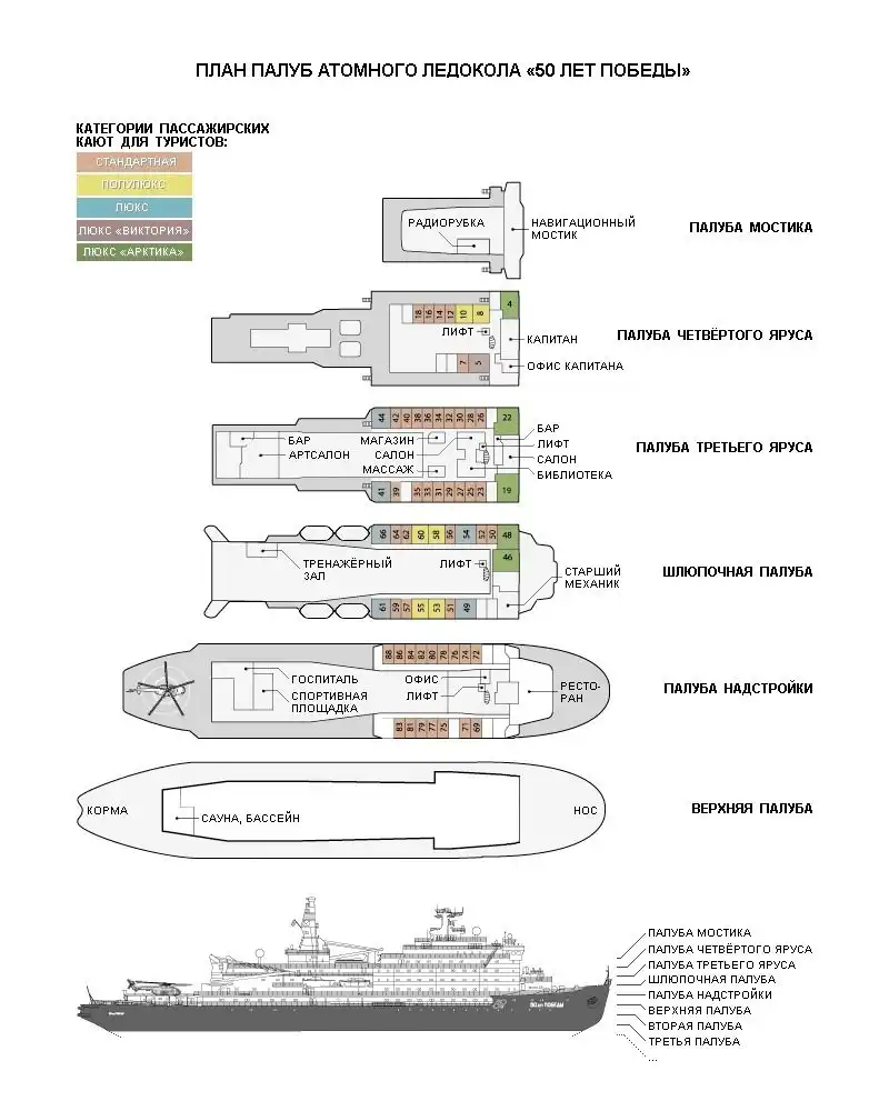 Между тем, «50 лет Победы» не всегда занимается тем, что вызволяет другие суда из плена. На самом деле он также ориентирован на выполнение арктических круизов. Так, вы лично можете отправиться к Северному Полюсу, заплатив энную сумму за билет. Поскольку пассажирских кают как таковых здесь нет, туристов размещают в каютах состава корабля. Зато на борту есть собственный ресторан, бассейн, сауна, тренажерный зал .