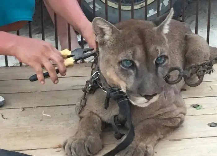Домом для пумы по кличке Мустафа служил кузов пикапа, где она жила закованная в цепи.