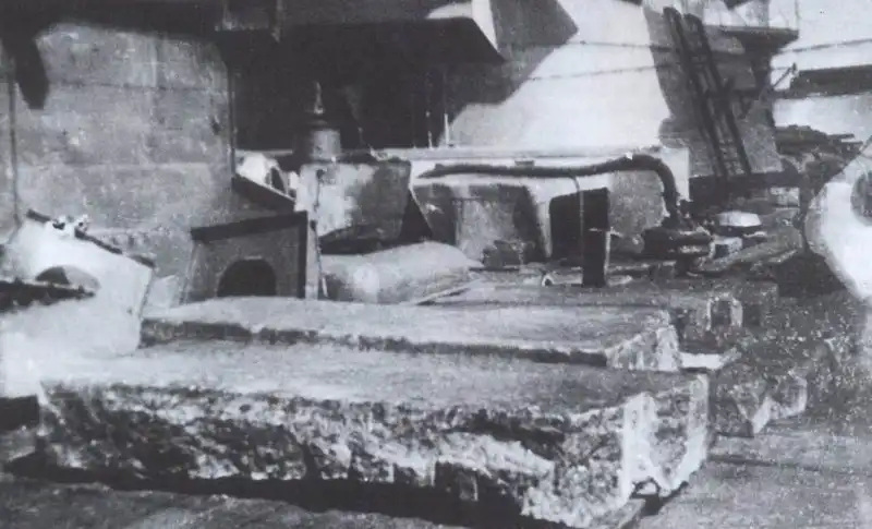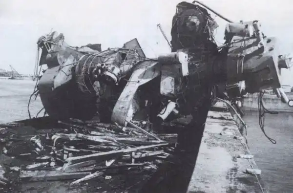 Часть фок-мачты линкора, отброшенная от корабля силой взрыва на