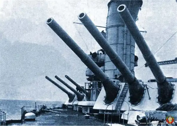На переднем плане крыша второй башни. Хорошо видны стволы орудий первой башни главного