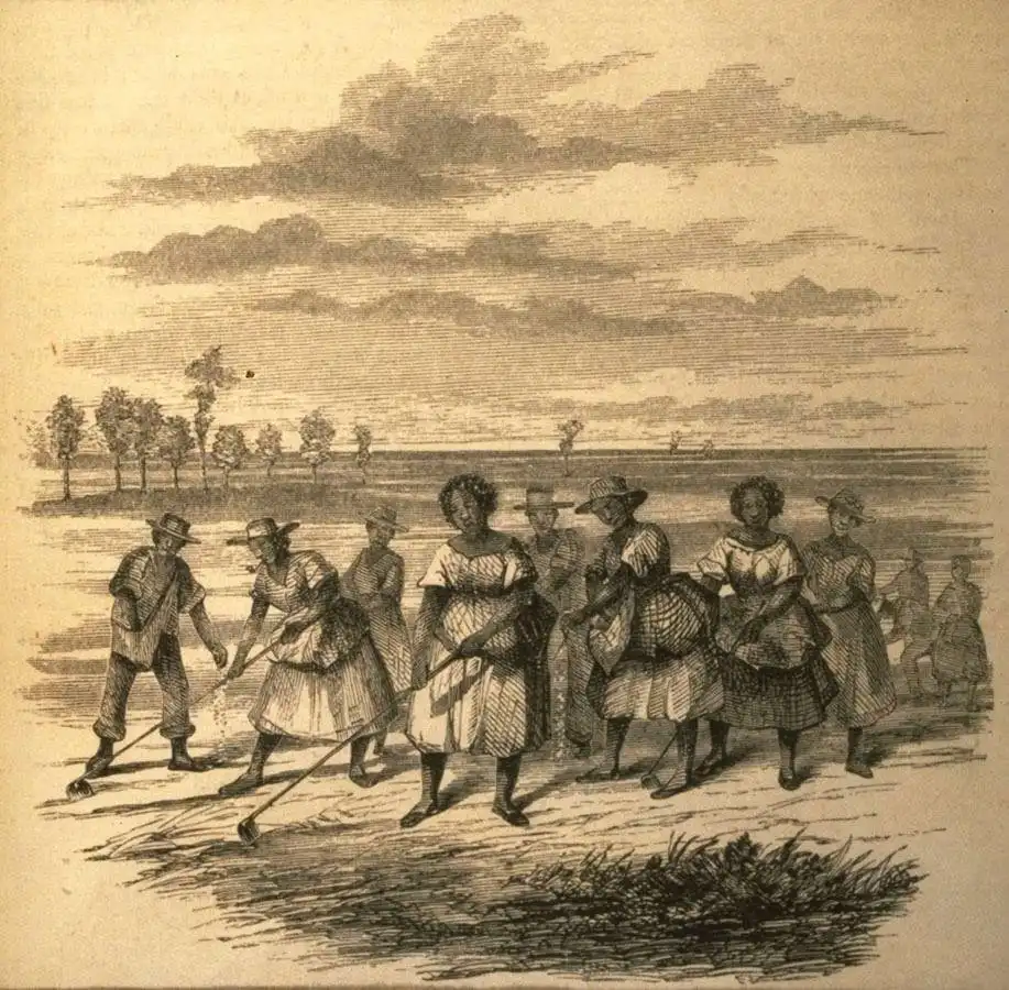 Рабы занимаются посадкой риса (Юг США, 1859 год)