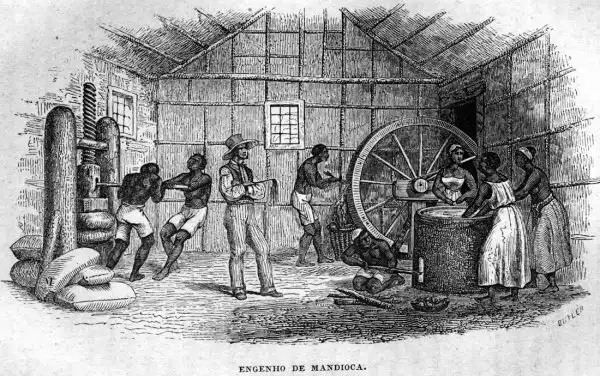 Рабы занимаются переработкой маниоки (Бразилия, 1835 год)
