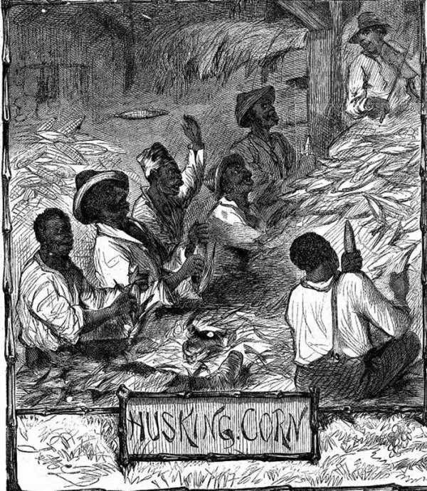Рабы занимаются вылущиванием зерен из кукурузных початков (Юг США, 1861 год)