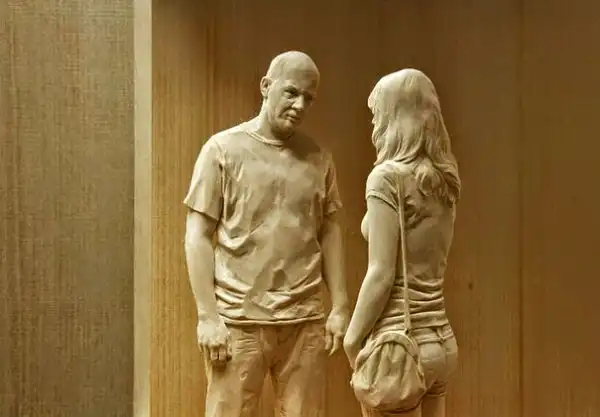 Его деревянные скульптуры людей точь-в-точь как настоящие.