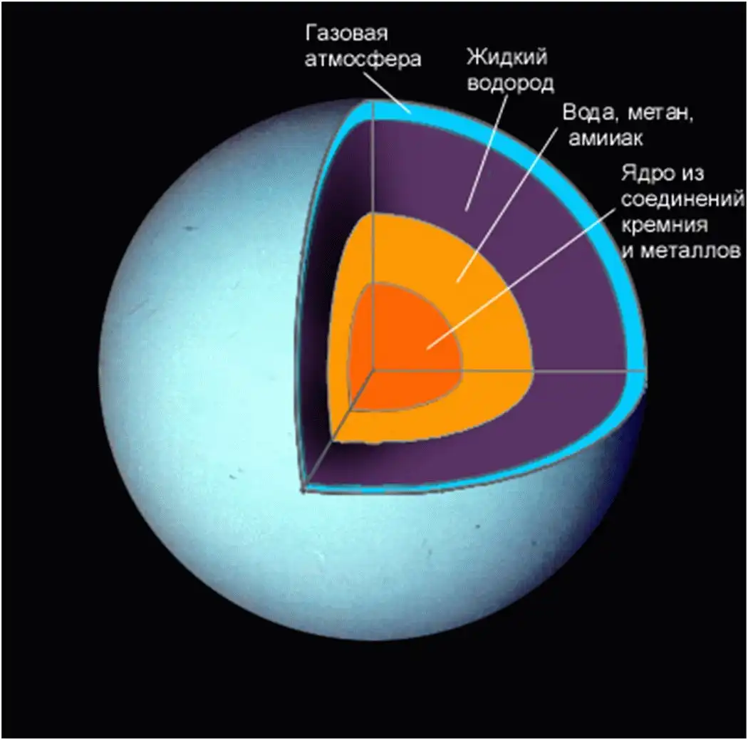 С глубиной водород начинает изменять свою структуру с газообразной на жидкую. Это является следствием роста давления и температуры. На глубине свыше тридцати тысяч километров от поверхности, жидкий водород переходит в металлический. Этот процесс начинается при давлении в 3 млн. атмосфер (1 физ. атмосфера = 760 мм рт. столба). Ну а в самом центре находится ядро, диаметр которого приближается к 30 000 тыс. км. Состав его представляет из себя железокремниевое соединение с примесью льдов из аммиака, метана и воды. Температура ядра 20 000К (1К=-272,15С), а давление составляет 25 млн. атмосфер.