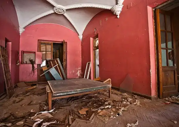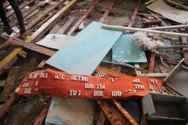Внутри картина другая. Везде валяется мусор, окна выбиты. В комнатах — разломанная мебель, изорванные старые книги и фотографии.