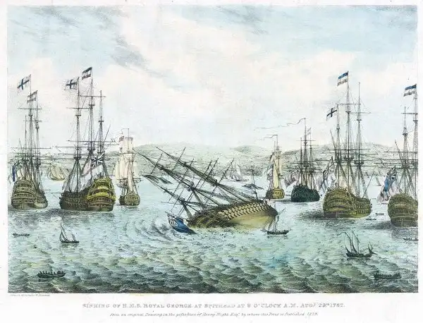 В конце августа 1782 года «Ройял Джордж» под флагом контр-адмирала Ричарда Кемпенфельда бросил якорь на рейде Спидхеда, где располагалась база Королевского флота. Гордость Британии нуждалась в мелком ремонте, (кингстон правого борта пропускал воду). После его завершения флагман должен был отправиться в Средиземное море на встречу с английской эскадрой.