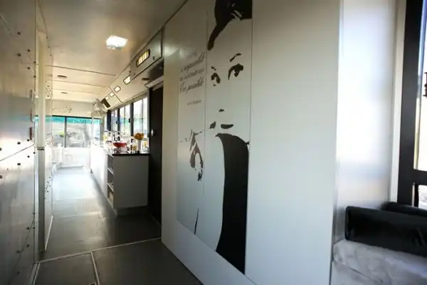 Этот дом-автобус имеет одну спальную комнату с огромной кроватью, туалет и душ, несколько шкафов, а также гостиную с кухней и столовой.