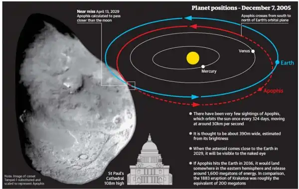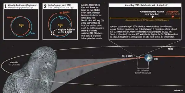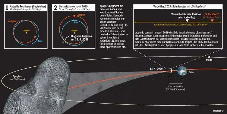 Первоначальные расчеты показывали, что Апофис может рухнуть на Землю в 2029 или 2036 годах, но впоследствии они не подтвердились. Однако, проходя мимо нашей планеты, космическое чудовище будет менять орбиту и возвращаться к ней еще не раз.