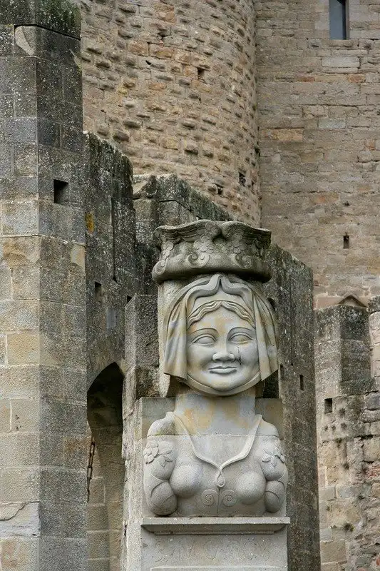 Напоследок, скормила оставшееся зерно последней свинье, которую и сбросила к подножью башни. Живот свиньи распоролся, и воины увидели зерно. Карл Великий был ошеломлен этим и приказал снять осаду с города. Дама Каркас была вне себя от радости. Она принялась играть на трубе, тем самым, поддразнивая франков и их императора. Карл не слышал этих победных звуков, но его оруженосец сказал ему: «Сир, Каркас зовет Вас»(«Sire, Carcas te sonne»). Так, по легенде, родилось название крепости — Каркассон. Правда, мне никто не ответил, как это в умирающем осажденном городе сохранилось зерно и свинья? Легенда, знаете ли! Так это было или нет, но сейчас любой может лицезреть бюстовое изображение Дамы Каркас на одной из колонн моста перед Нарбонскими воротами.