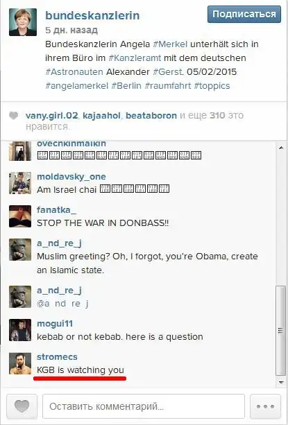 3 июня у канцлера Германии Ангелы Меркель появился свой аккаунт в социальной сети Instagram. Практически сразу же на странице стали появляться сообщения на кириллице от «русских троллей». Как оказалось, российские пользователи соцсети устроили «целенаправленную атаку», в ходе которой они оставляли гневные высказывания в адрес самой госпожи Меркель и касательно событий в Украине. Несколько часов потребовалось на то, чтобы удалить все гневные комментарии, однако, их было так много, что решили удалять все сообщения, написанные на кириллице. После чистки оскорбительные сообщения продолжили поступать.