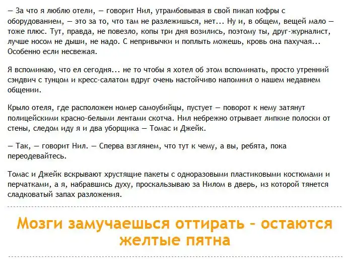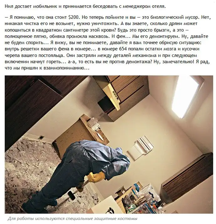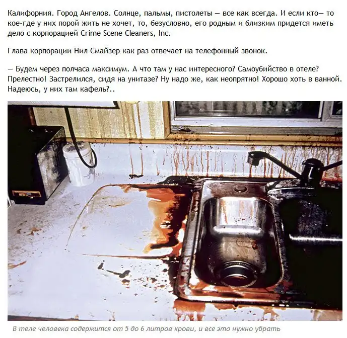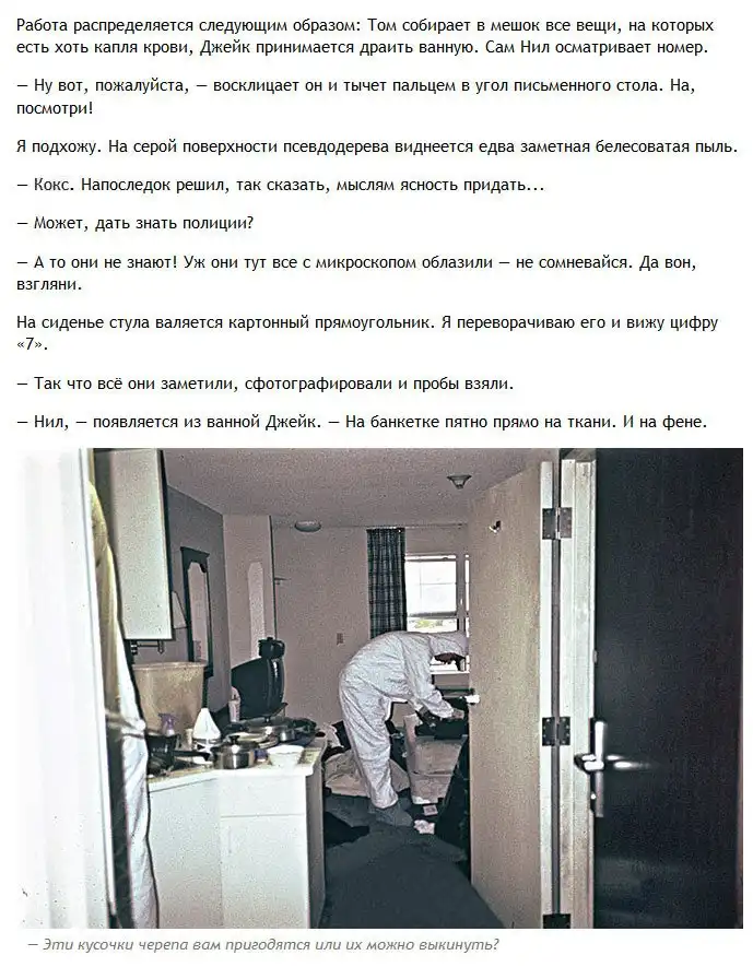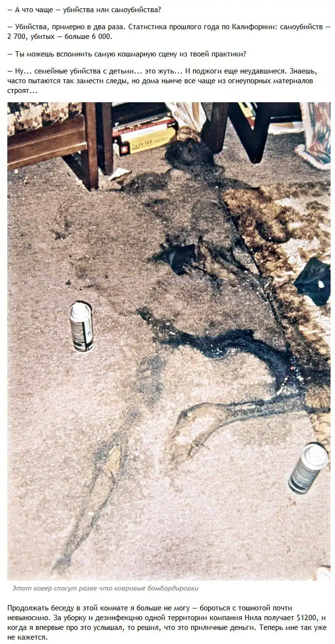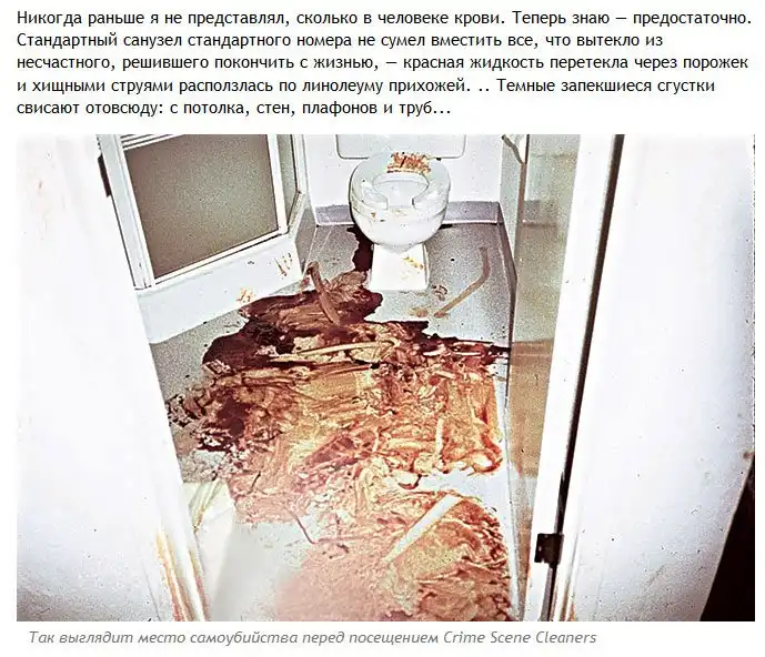 Один журналист решил взглянуть на то, как происходит уборка помещений после совершения в них убийств и самоубийств и отправился на эту непростую работу со специалистом в данной области. Обо всем увиденном журналист рассказал в своей статье. Осторожно, фото, которые вы увидите далее, не из приятных.