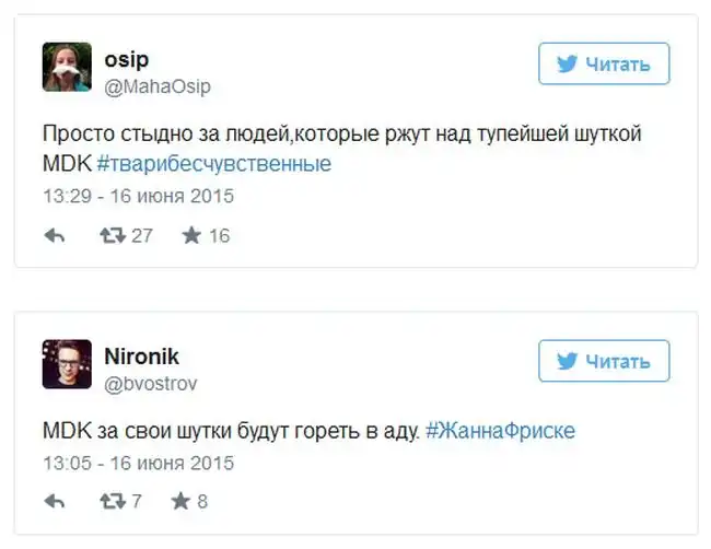 Серьезный скандал разгорелся после того, как на странице популярного паблика «MDK» в социальной сети «ВКонтакте» появилась неуместная шутка, связанная со смертью певицы Жанны Фриске.