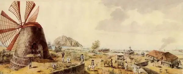 Плантация по выращиванию и переработке сахарного тростника в Антигуа (Вест-Индия, 1801 год)