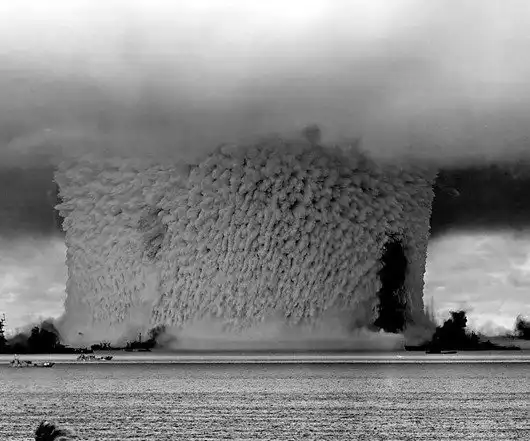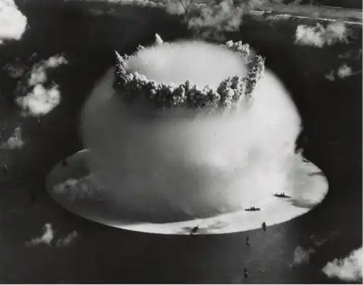 Вид с воздуха на ядерный гриб “Эйбл”, поднимающийся из лагуны атолла Бикини, который виден на заднем плане. Облако перенесло радиоактивное загрязнение в стратосферу, 23 килотонны, 1 июля 1946 года.
