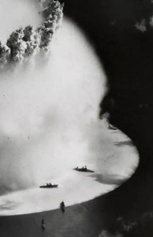 Грибообразное облако, у которого вместо пылевой ножки водяной столб. Справа на столбе видна прореха: линкор «Арканзас» закрыл собой выброс брызг.