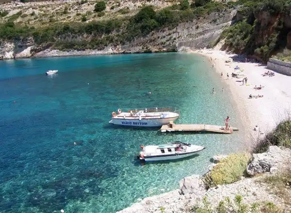 Наверное, самый известный вид Закинфа – фото бухты Навагио: окруженный скальным обрывом белый пляж, посередине которого виднеется как многие пишут "деревянный остов старинного корабля". Конечно, корабль – декоративная уловка. А какой он "деревянный" вы можете убедиться и на фотографиях. Но есть здесь и натуральные красоты, например, Голубые пещеры, где морская вода насыщена кальцием, целебна и имеет уникальный яркий цвет.