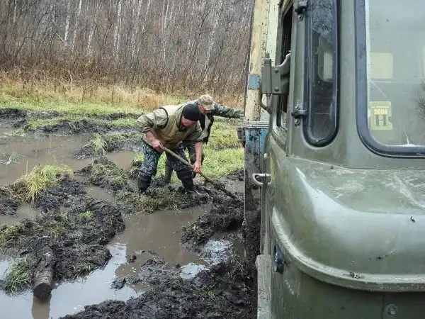 Предзимье выбрали не случайно: летом здесь даже накомарники не спасают: полно слепней, оводов и паутов, трава выше человеческого роста, а зимой — снега по грудь, тоже не проберешься. Хотя осень тоже оказалась капризной: дорога превратилась в маслянистую жижу… ГАЗ-66, специально выбранный в качестве транспорта участниками экспедиции как самый приспособленный к передвижению в таких условиях, и тот то и дело буксовал… Что уж говорить про штурм 16-ти бродов?! Именно столько раз приходилось преодолевать водные преграды по дороге от точки старта — базы отдыха «Дивная» до места падения метеорита.