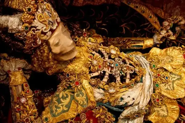 приподнята над невероятными останками католических святых.