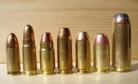 Патрон .50 AE (крайний справа) в сравнении с патронами 9mm Parabellum, 7,62×25, .357 SIG, 10mm Auto, .40 S&W и .45 GAP (слева на право)