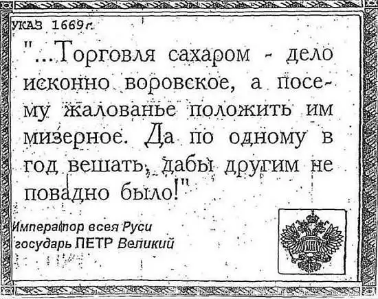 Впредь указую господам сенаторам речь в присутствии держать не по писанному, а токмо своими словами, дабы дурь каждого видна была всякому.