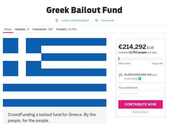 29-летний британец Том Фини (Thom Feeney), работающий продавцом обуви в Лондоне, решил спасти Грецию от дефолта и запустил на краудфандинговой платформе программу по сбору средств для оплаты внешнего долга. За неделю необходимо собрать 1,6 миллиарда евро.
