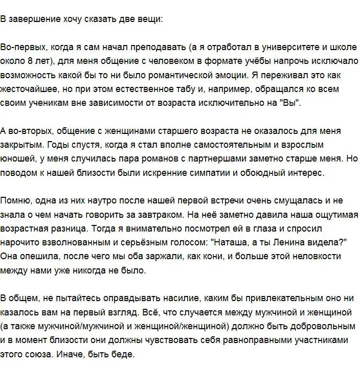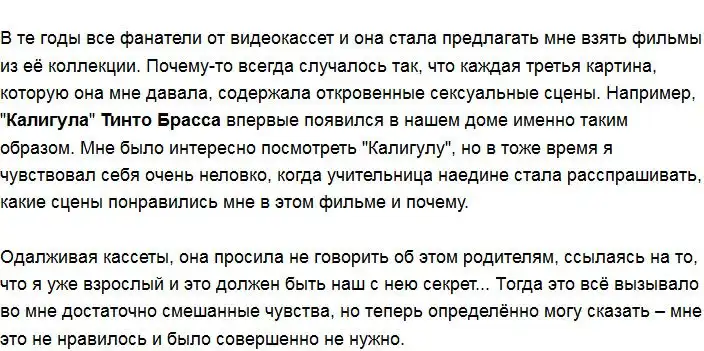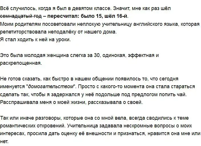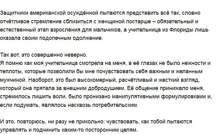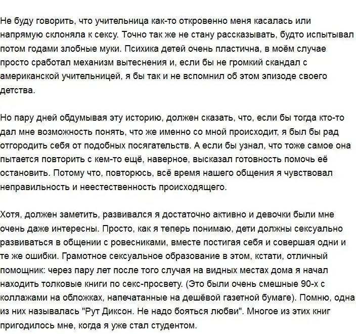 История с американской учительницей Дженнифер Фитчер, имевшей сексуальные связи с тремя 17-летними учениками и получившей 22 года тюрьмы, всколыхнула весь интернет. Немало нашлось людей, которые встали на защиту преподавателя, аргументируя это тем, что в 17 лет многие подростки уже занимаются сексом, и они пошли на это сознательно. Рассуждать на эту тему можно и дальше, но мы предлагаем вам откровения одного блогера, который пережил сексуальные домогательства учительницы в подростковом возрасте и решил рассказать об этом.