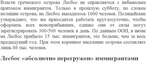 Эти документы позволяют им находиться в стране от 1 до 6 месяцев. Мигрантов селят в палатках, разбитых на бывшем стадионе, и в единственном на острове пункте для беженцев. По словам корреспондента Би-би-си Анны Холлиган, оба этих лагеря «абсолютно перегружены». Представители благотворительной организации «Медицина без границ» в интервью Би-би-си признались, что худшей ситуации, чем на Лесбосе, они не видели нигде в Европе.