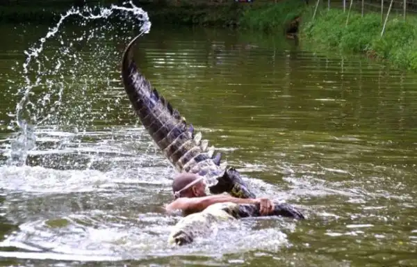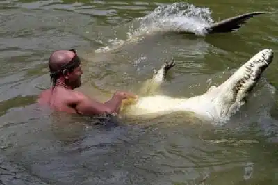 Четыре года назад друзья уговорили рыбака показывать игры с Почо зрителям. И вот у озера собираются толпы туристов, которые с изумлением наблюдают как четырехсоткилограммовый хищник и человек играют в воде.