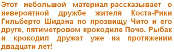 – Но я нисколько не жалею об этом. Я очень люблю животных, особенно тех, которые подверглись страданию! — Почо стал моим лучшим другом, — утверждает мужчина. — Конечно, это очень опасное занятие, но у нас с Почо настоящая дружба! Интересно, что Чито неоднократно отпускал крокодила на свободу, но тот всегда возвращался назад.